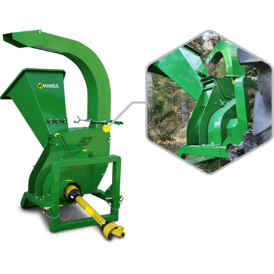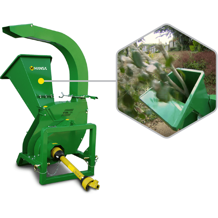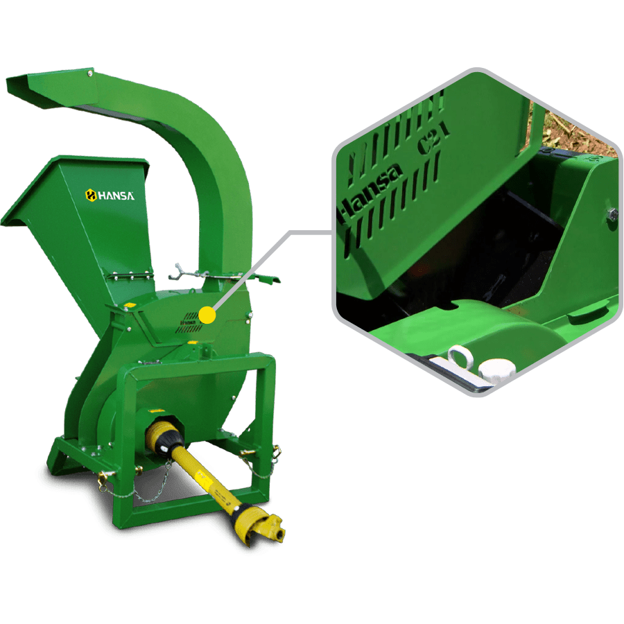 The C21PTO delivers extraordinary self-feeding performance. The large 80kg cutting disc rotates at 1530 RPM creating a self perpetuating inertia. The draft created by the winged cutting disc pulls foliage into the machine fast and effectively through the 200 x 2850 mm infeed opening. The outlet chute height of 1945 mm allows the user to load chip onto a trailer, ute or stockpile.